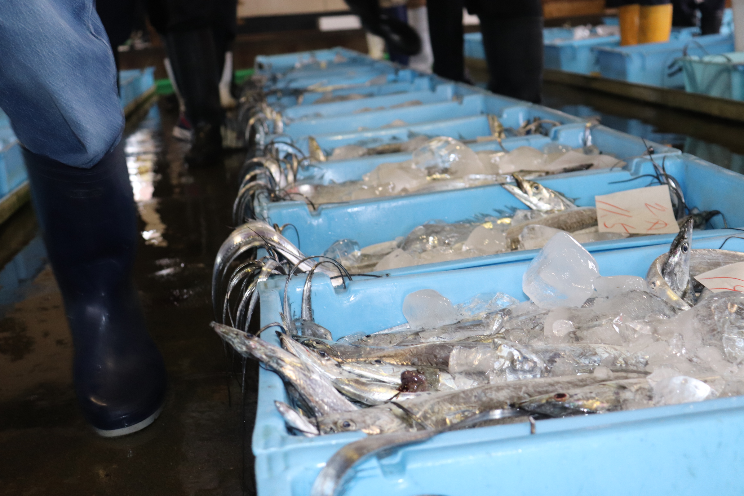 同時刻、尾末市場でも競り開始→経験豊富なスタッフが入札で魚を買います。